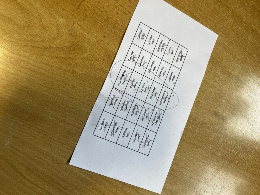 Zatim su osmislili i zaigrali jezični bingo s pripremljenim karticama. Igra je unijela natjecateljski duh u razred, a učenici su s velikim veseljem prepoznavali i zaokruživali riječi na različitim jezicima.