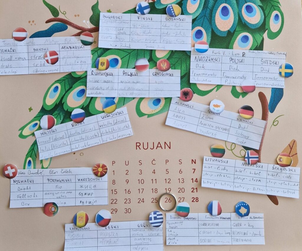 Učenici 3. b razreda Europski dan jezika obilježili su na Satu razrednika tijekom kojeg su, pod vodstvom nastavnice Marte Tukač, u manjim timovima istraživali kako osnovni stručni pojmovi iz elektrotehnike i računalstva (npr. struja, napon, prekidač, žica, utičnica, energija…) zvuče na različitim europskim jezicima. Pomoću interneta i rječnika pronalazili su prijevode na engleski, njemački, talijanski, francuski i druge europske jezike, a zatim su izrađivali mini-plakate na koje su, uz riječi, dodavali i zastave država u kojima su zadani jezici službeni.