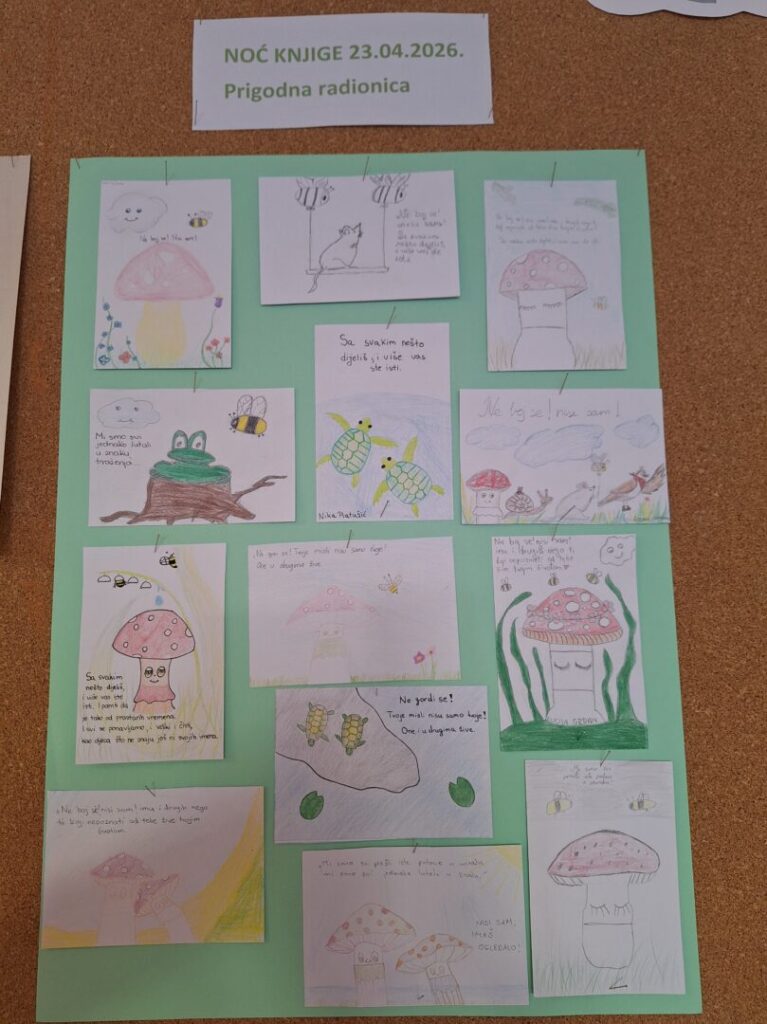 U četvrtak, 23. travnja, naša je škola postala središte mašte i razgovora o knjigama. Povod je bila manifestacija Noć knjige, a središnji događaj književni susret koji su učenici s nestrpljenjem iščekivali. Ove godine naglasak je bio na zajedništvu, solidarnosti i međusobnoj povezanosti svih bića. Misao vodilja pronađena je u Ujevićevoj pjesmi Pobratimstvo lica u svemiru. Kako bi učenici pobliže mogli shvatiti tu važnost pojedinca odlučili smo kroz jednu slikovnicu (Laura i frka u botaničkom vrtu) i njezin glavni lik naglasiti te temelje zdravog pojedinca (gl. lik gljiva Laura). U goste nam se rado odazvala i sama autorica cijenjene slikovnice, Tanja Štabek. Iako su Ujevićeva pjesma i slikovnica o Lauri na prvi pogled nespojive, povezuje ih snažna humanistička ideja o jedinstvu i međusobnoj povezanosti svih bića.