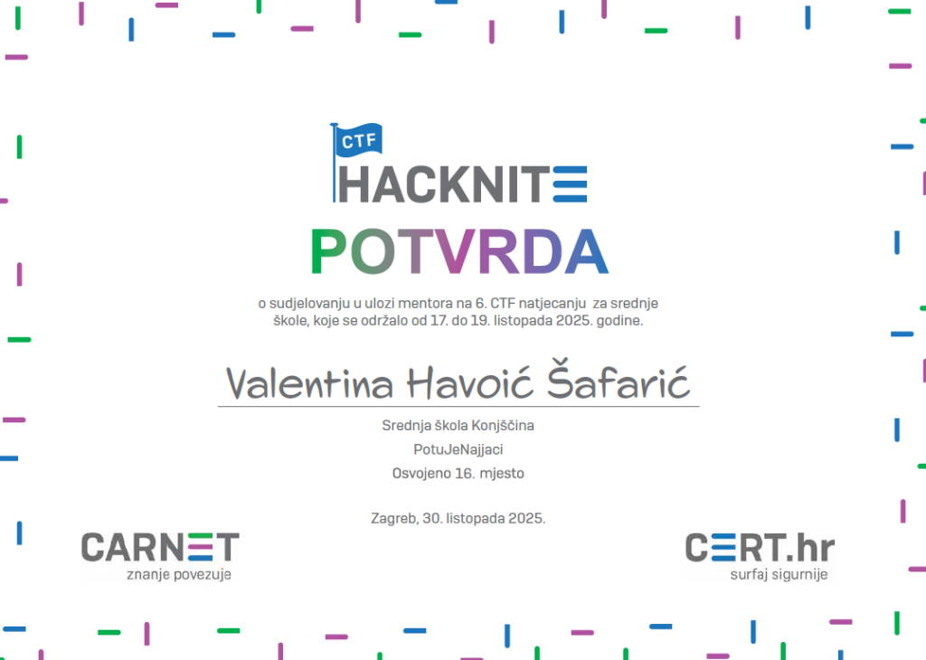 Učenici Srednje škole Konjščina postigli su izvrstan rezultat na 6. CTF (Capture The Flag) natjecanju za srednje škole, poznatijem kao HACKNITE, koje se održalo od 17. do 19. listopada 2025. godine. Natjecanje su organizirali CARNET i CERT.hr.